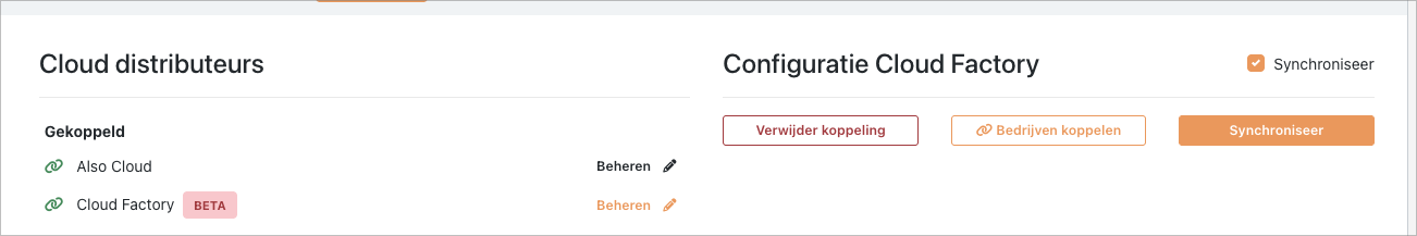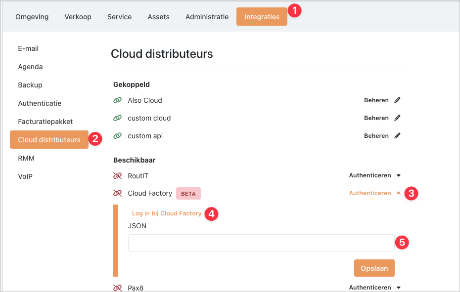 - Ga naar Integraties > Cloud distributeurs en kies voor Cloud Factory