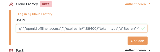- Je krijgt hier een JSON response terug van Cloud Factory (helaas hebben ze dit niet mooier gemaakt :)) Deze mag je compleet kopieëren.