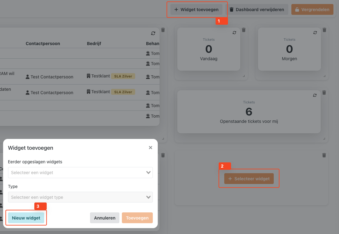 Bij het toevoegen van een widget kies je een eerder opgeslagen widget en het gewenste weergavetype (tabel of aantal).