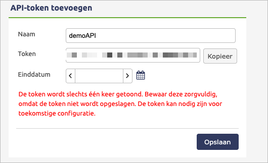 Kopieer en plak hier de API token.