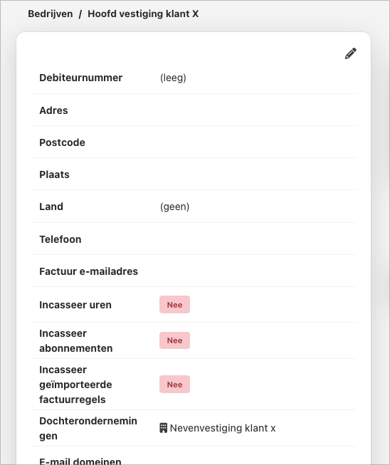Na het opslaan zie je onder de hoofdvestiging automatisch de gekoppelde nevenvestigingen als dochterbedrijven.