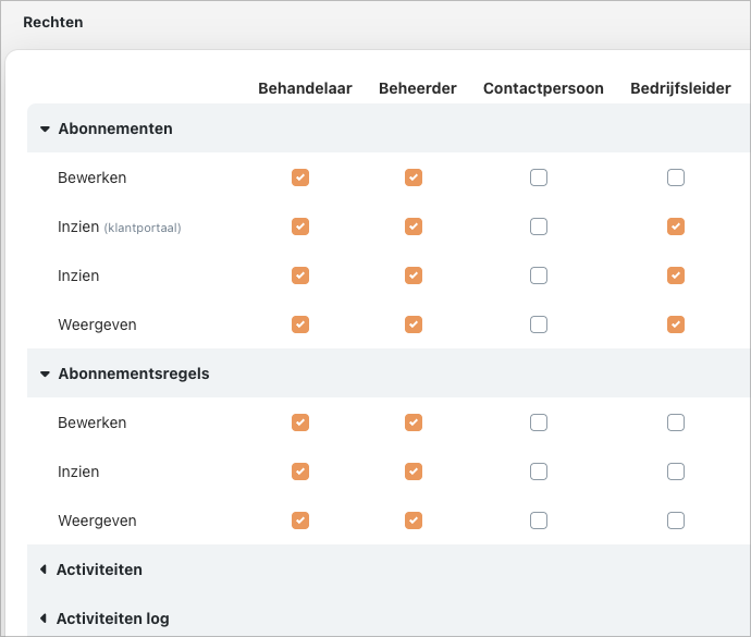 Hier kun je vinkjes aan en uit zetten voor de individuele rollen. Als je bijvoorbeeld de behandelaars de statistieken niet wilt tonen, vink je onder Behandelaar de rechten 'stats.stats' uit.